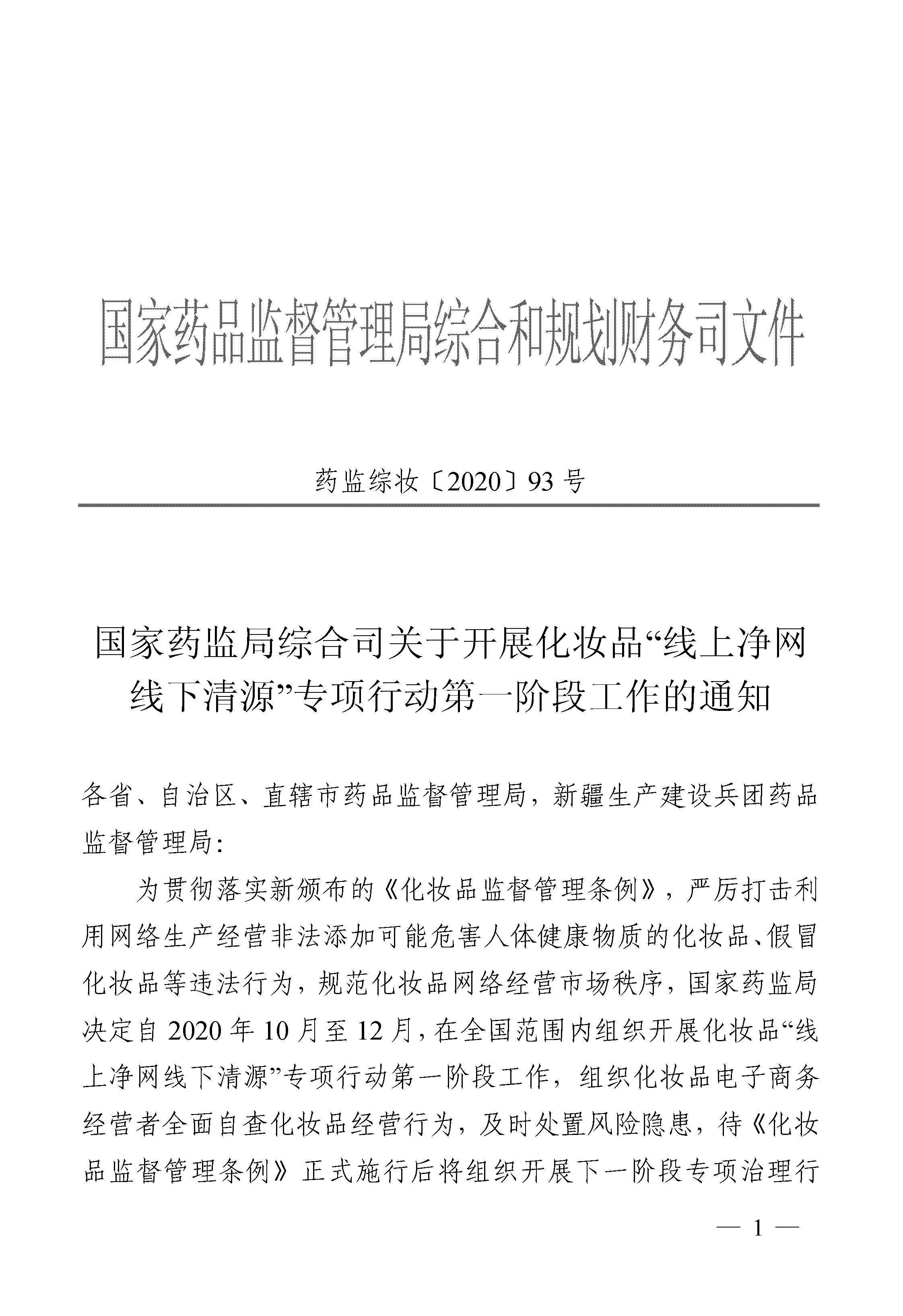 附件:国家药监局综合司关于开展化妆品“线上净网线下清源”专项行动第一阶段工作的通知