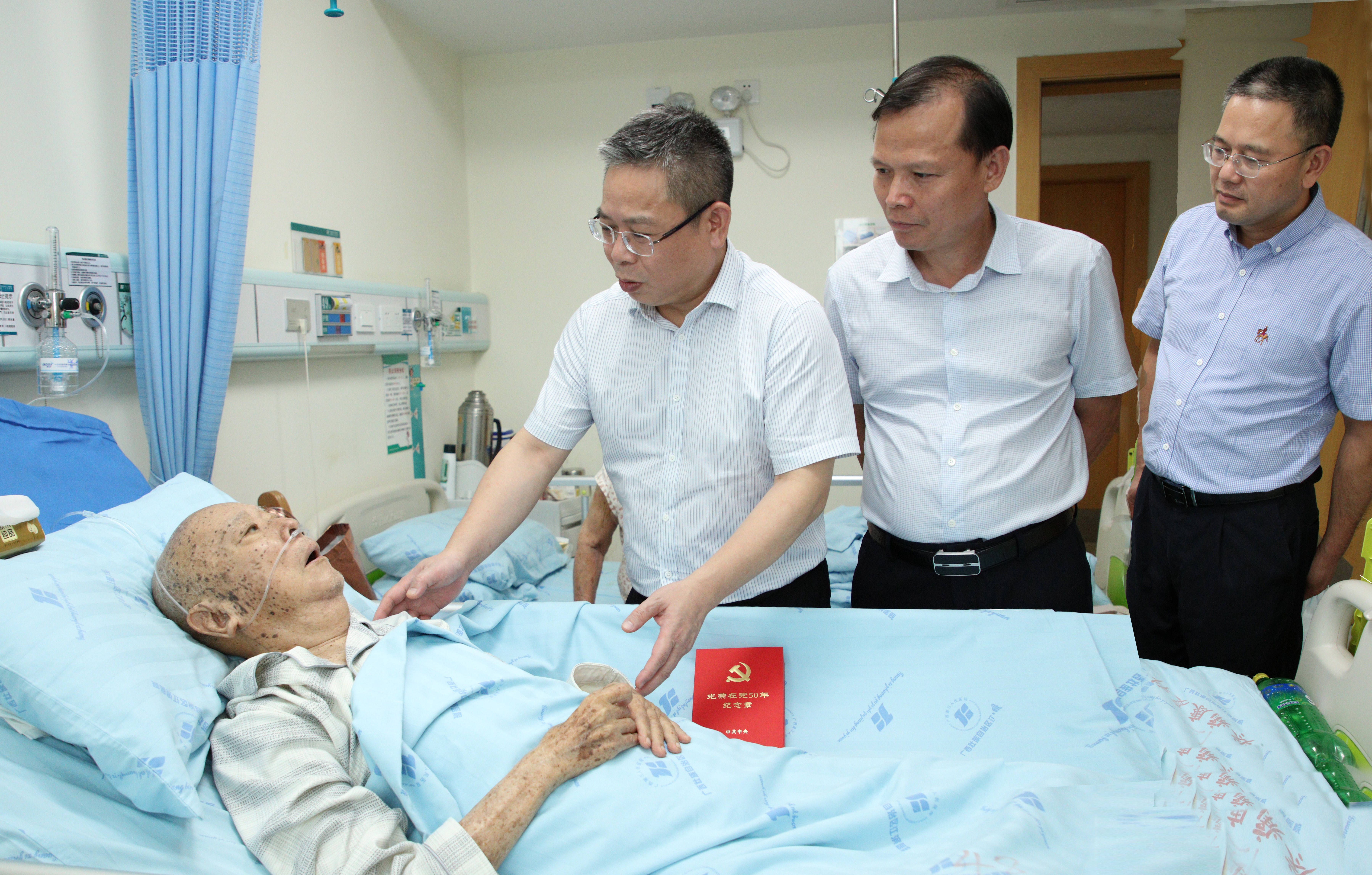 局领导带着慰问品,分别来到离退休老党员家中,与他们促膝谈心,通报国产a片 近年来的工作成效,倾听老人们讲述过去的战斗岁月,悉心询问老人的身体、家庭等情况,帮助他们解决实现困难。在获知90岁高龄已有62年党龄的张晋平老人生病住院,黄琛带着慰问品前往医院探望,在病房里向医护人员和其家属详细了解老人家的病情,鼓励老人家坚定信心、战胜病魔,早日康复。并为他颁发“光荣在党50年”纪念章,老人家激动得热泪盈眶。