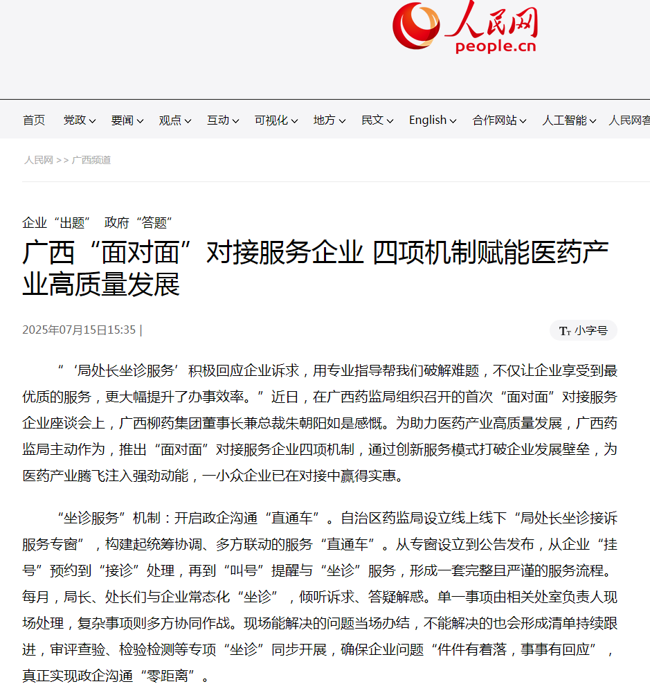 “‘局处长坐诊服务’积极回应企业诉求,用专业指导帮我们破解难题,不仅让企业享受到最优质的服务,更大幅提升了办事效率。”近日,在广西药监局组织召开的首次“面对面”对接服务企业座谈会上,广西柳药集团董事长兼总裁朱朝阳如是感慨。为助力医药产业高质量发展,广西药监局主动作为,推出“面对面”对接服务企业四项机制,通过创新服务模式打破企业发展壁垒,为医药产业腾飞注入强劲动能,一小众企业已在对接中赢得实惠。