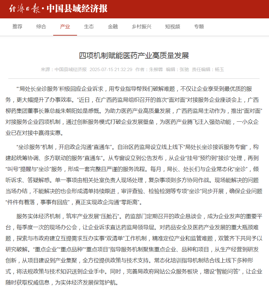 “‘局处长坐诊服务’积极回应企业诉求,用专业指导帮我们破解难题,不仅让企业享受到最优质的服务,更大幅提升了办事效率。”近日,在广西药监局组织召开的首次“面对面”对接服务企业座谈会上,广西柳药集团董事长兼总裁朱朝阳如是感慨。为助力医药产业高质量发展,广西药监局主动作为,推出“面对面”对接服务企业四项机制,通过创新服务模式打破企业发展壁垒,为医药产业腾飞注入强劲动能,一小众企业已在对接中赢得实惠。