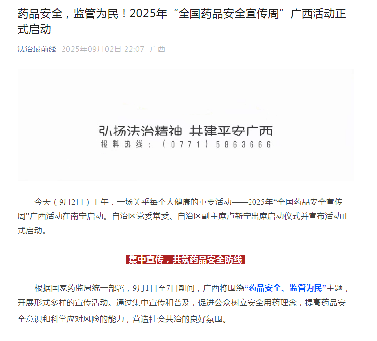 根据国家药监局统一部署,9月1日至7日期间,广西将围绕“药品安全、监管为民”主题,开展形式多样的宣传活动。通过集中宣传和普及,促进公众树立安全用药理念,提高药品安全意识和科学应对风险的能力,营造社会共治的良好氛围。