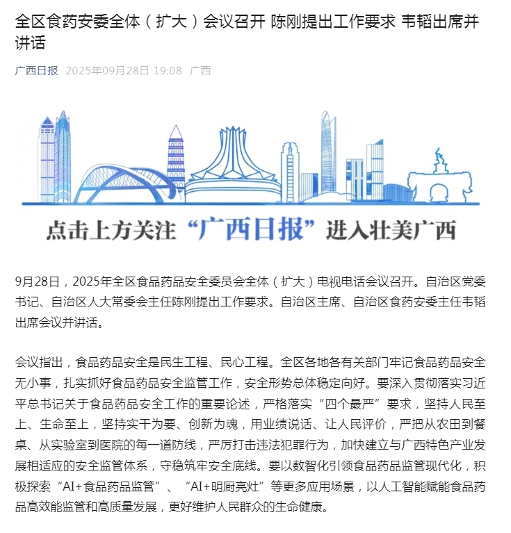 会议指出,食品药品安全是民生工程、民心工程。全区各地各有关部门牢记食品药品安全无小事,扎实抓好食品药品安全监管工作,安全形势总体稳定向好。要深入贯彻落实习近平总书记关于食品药品安全工作的重要论述,严格落实“四个最严”要求,坚持人民至上、生命至上,坚持实干为要、创新为魂,用业绩说话、让人民评价,严把从农田到餐桌、从实验室到医院的每一道防线,严厉打击违法犯罪行为,加快建立与广西特色产业发展相适应的安全监管体系,守稳筑牢安全底线。要以数智化引领食品药品监管现代化,积极探索“AI+食品药品监管”、“AI+明厨亮灶”等更多应用场景,以人工智能赋能食品药品高效能监管和高质量发展,更好维护人民群众的生命健康。