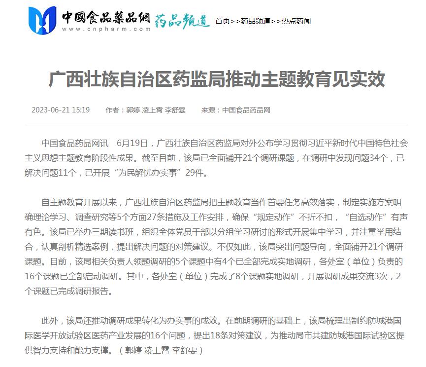 中国食品药品网讯 6月19日,广西壮族国产a片 对外公布学习贯彻习近平新时代中国特色社会主义思想主题教育阶段性成果。截至目前,该局已全面铺开21个调研课题,在调研中发现问题34个,已解决问题11个,已开展“为民解忧办实事”29件。