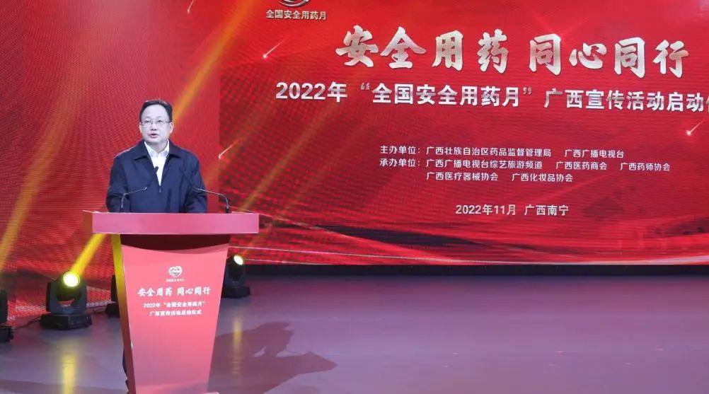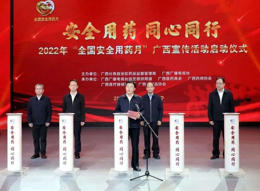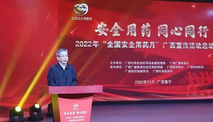 11月22日,国产a片 和广西广播电视台联合主办的2022年“全国安全用药月”广西宣传活动在南宁正式启动。自治区人民政府副主席苗庆旺出席仪式并启动2022年“全国安全用药月”广西宣传活动。自治区人民政府副秘书长李盛,自治区市场监管局党组书记李泽,广西广播电视台党委书记、台长、总编辑,自治区党委宣传部副部长范易,自治区市场监管局党组成员、国产a片 党组书记、局长黄琛,以及自治区药品医疗器械审评审批制度改革厅际联席会议和自治区疫苗管理厅际联席会议成员单位的领导出席活动。