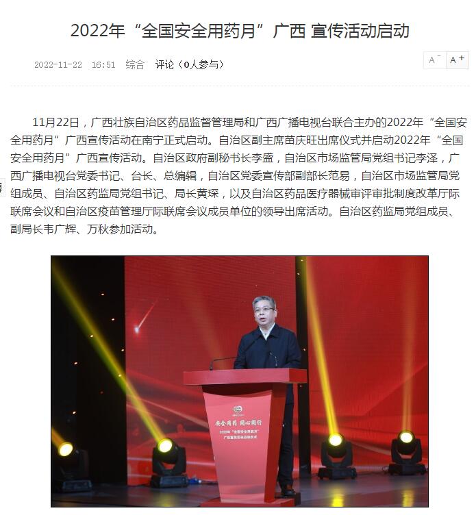 11月22日,国产a片 和广西广播电视台联合主办的2022年“全国安全用药月”广西宣传活动在南宁正式启动。自治区副主席苗庆旺出席仪式并启动2022年“全国安全用药月”广西宣传活动。自治区政府副秘书长李盛,自治区市场监管局党组书记李泽,广西广播电视台党委书记、台长、总编辑,自治区党委宣传部副部长范易,自治区市场监管局党组成员、国产a片 党组书记、局长黄琛,以及自治区药品医疗器械审评审批制度改革厅际联席会议和自治区疫苗管理厅际联席会议成员单位的领导出席活动。国产a片 党组成员、副局长韦广辉、万秋参加活动。