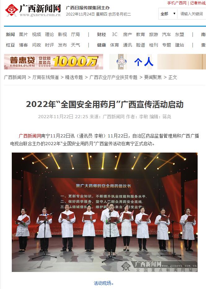 广西新闻网南宁11月22日讯(通讯员 李敏)11月22日,自治区药品监督管理局和广西广播电视台联合主办的2022年“全国安全用药月”广西宣传活动在南宁正式启动。