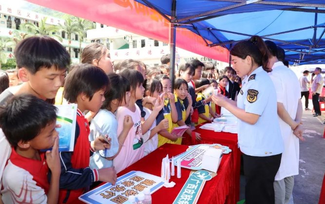 广西药监局办公室、化妆品监管处,河池检查分局,自治区药品不良反应监测中心,河池市、大化县市场监管局,自治区皮肤病医院,百马乡中心小学,广西英和药业有限公司负责人及代表参加活动。(程奇 蓝必贤)