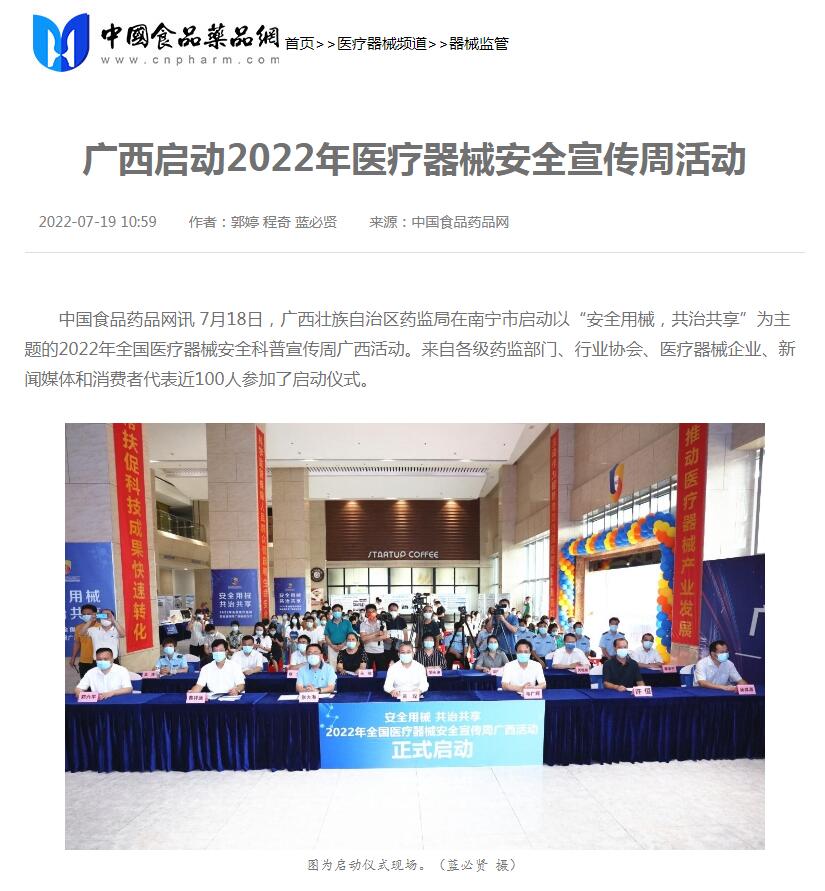 中国食品药品网讯 7月18日,广西壮族国产a片 在南宁市启动以“安全用械,共治共享”为主题的2022年全国医疗器械安全科普宣传周广西活动。来自各级药监部门、行业协会、医疗器械企业、新闻媒体和消费者代表近100人参加了启动仪式。