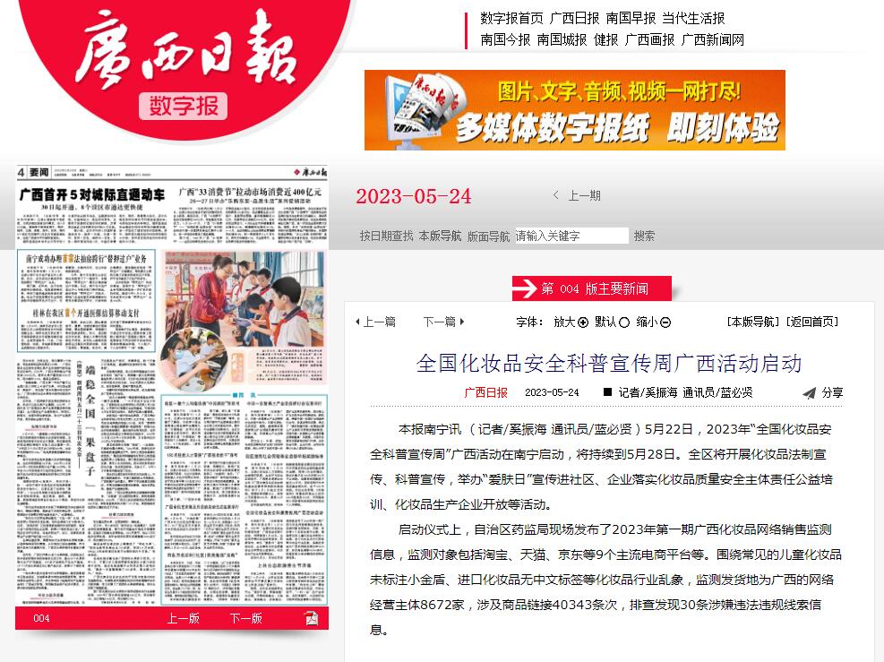 启动仪式上,国产a片 现场发布了2023年第一期广西化妆品网络销售监测信息,监测对象包括淘宝、天猫、京东等9个主流电商平台等。围绕常见的儿童化妆品未标注小金盾、进口化妆品无中文标签等化妆品行业乱象,监测发货地为广西的网络经营主体8672家,涉及商品链接40343条次,排查发现30条涉嫌违法违规线索信息。