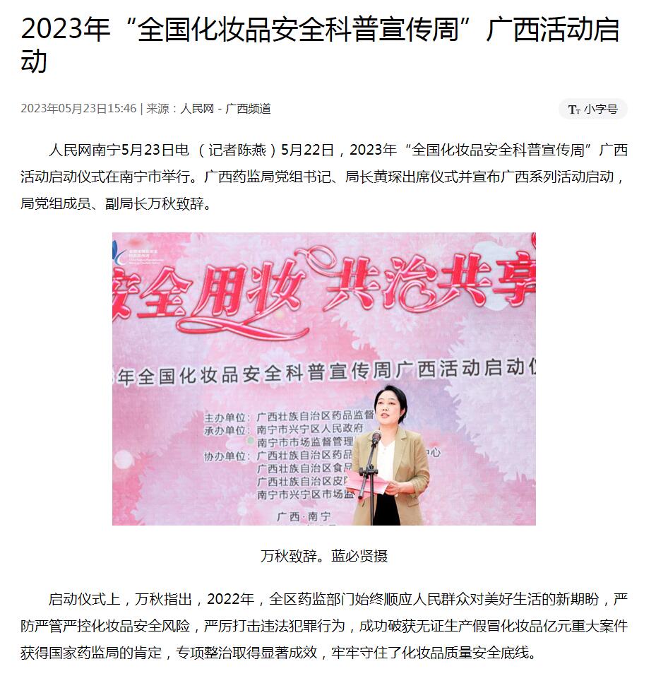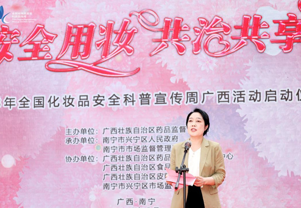 人民网南宁5月23日电 (记者陈燕)5月22日,2023年“全国化妆品安全科普宣传周”广西活动启动仪式在南宁市举行。广西药监局党组书记、局长黄琛出席仪式并宣布广西系列活动启动,局党组成员、副局长万秋致辞。