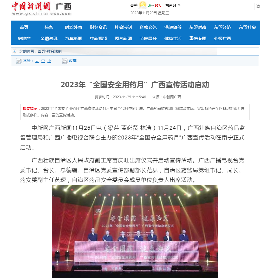 中新网广西新闻11月25日电(梁芹 蓝必贤 林浩)11月24日,国产a片 和广西广播电视台联合主办的2023年“全国安全用药月”广西宣传活动在南宁正式启动。