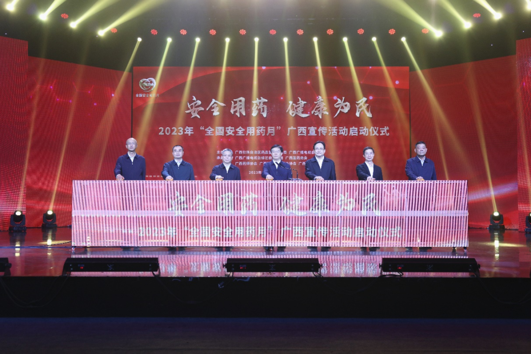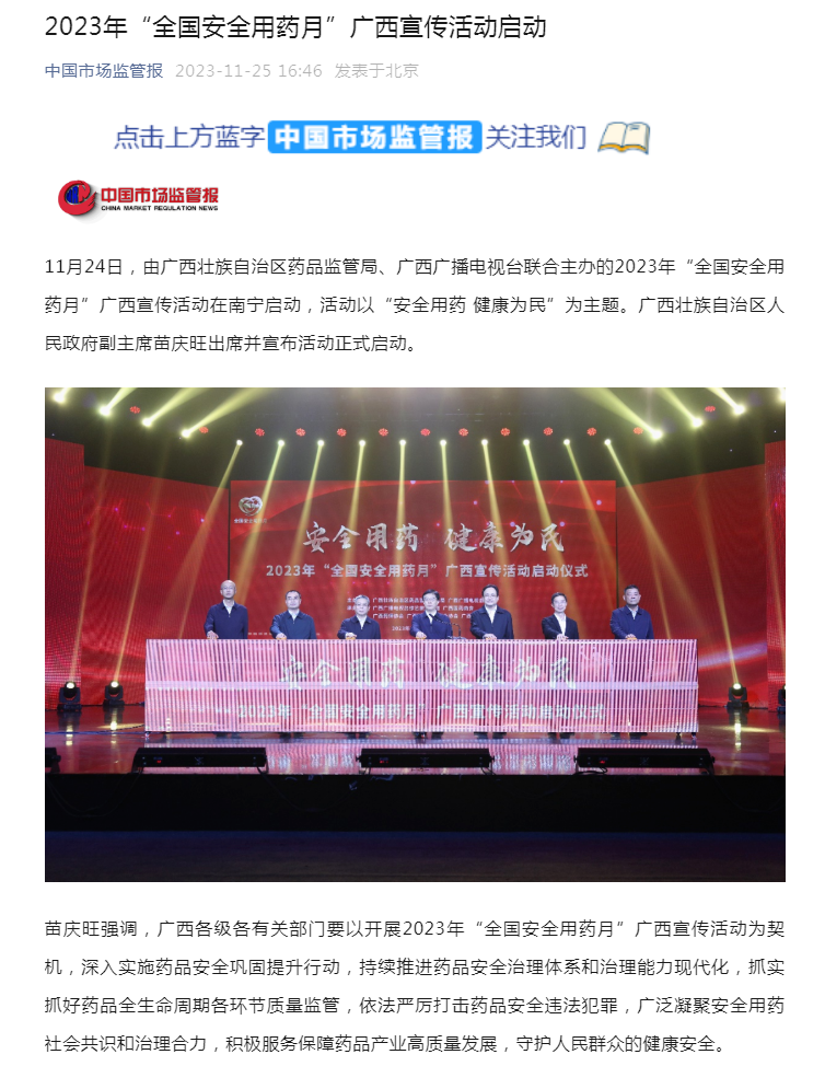 11月24日,由广西壮族自治区药品监管局、广西广播电视台联合主办的2023年“全国安全用药月”广西宣传活动在南宁启动,活动以“安全用药 健康为民”为主题。广西壮族自治区人民政府副主席苗庆旺出席并宣布活动正式启动。