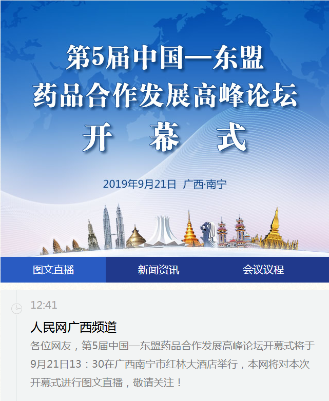 人民网将直播第5届中国—东盟药品合作发展高峰论坛开幕式